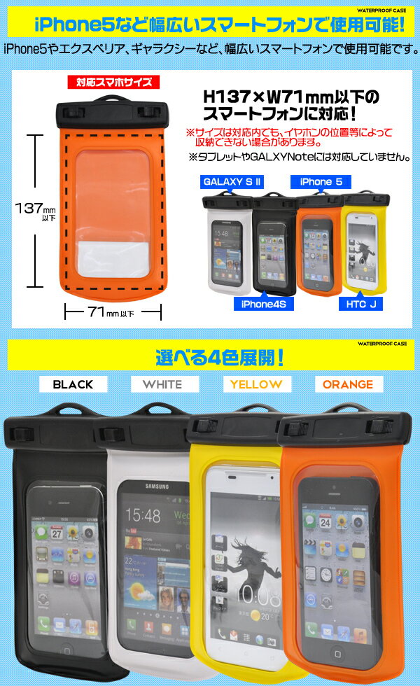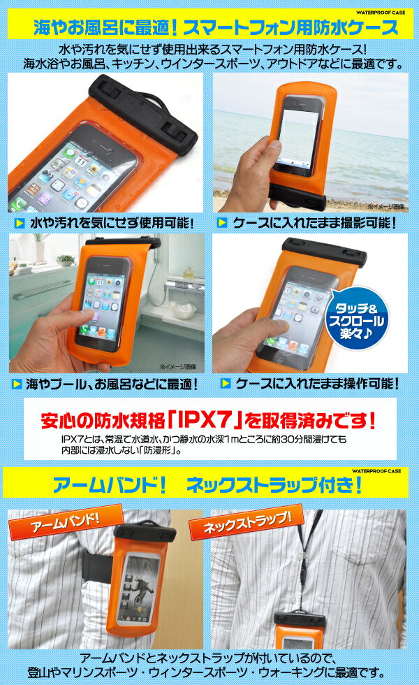 ■IPX7試験合格!防水加工のスマートフォンケース!海水浴やお風呂に便利な、スマートフォン用防水カラーケース!安心の防水規格「IPX7」を取得済みです! ■iPhone5など幅広いスマートフォンで使用可能!iPhone5やエクスペリア、ギャラクシーなど、幅広いスマートフォンで使用可能です。