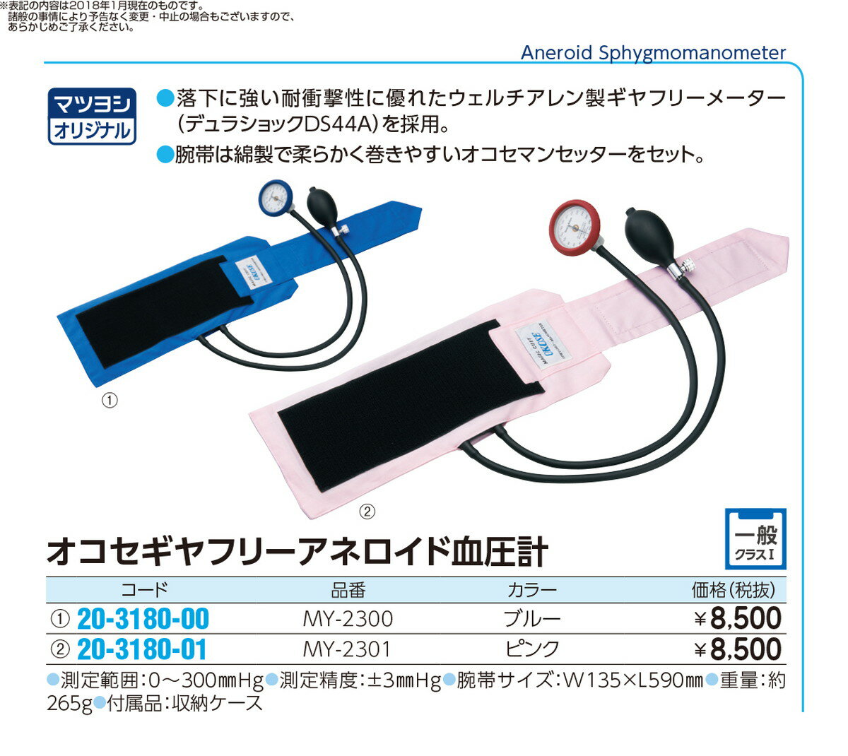 オコセギヤフリーアネロイド血圧計 MY-2301(ピンク)品番 20-3180-011入り 一般 診察・診断 診断機器 定価\8500 JAN 4535847002604 ●定価¥8,500円(税別)●商品説明●実用性抜群!!衝撃に強いメーターと巻きやすい腕帯を採用●メーターは落下に強い耐衝撃性に優れたウェルチアレン製ギヤフリーメーター(デュラショックDS44A)を採用。